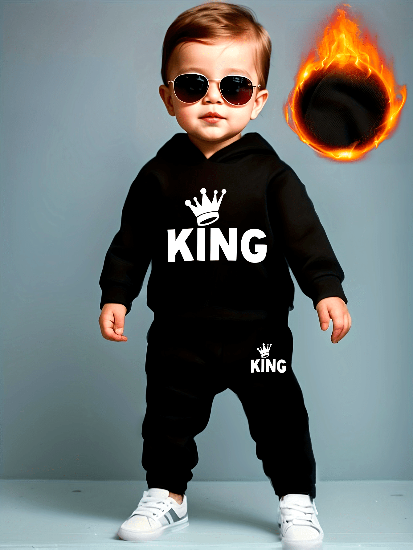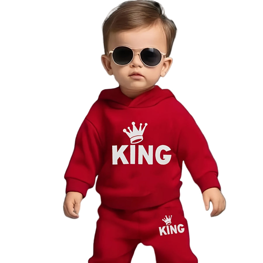 Cet ensemble sweat à capuche et pantalon décontracté pour bébé garçon, motif couronne KING, allie confort et style, spécialement conçu pour les enfants de 12 ans et moins. Confectionné en 100 % polyester...